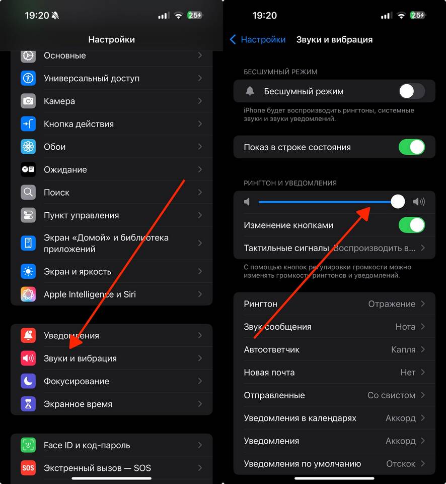 - Настройки > Звуки, тактильные сигналы